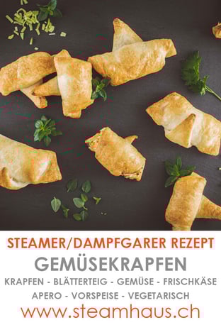Die vegetarische Variante der sehr bekannten Schinken-Gipfeli sind diese Gemüsekrapfen. Einfach alles Gemüse, dass du noch im Kühlschrank findest, klein hacken, mit etwas Frischkäse mischen, würzen und verpacken. Perfekt für eine schöne Apéroplatte, als Vorspeise mit Salat serviert oder einfach für zwischendurch als Snack. Und wenn du die Gemüse-Gipfeli im Dampfgarer machst, brauchst du nicht einmal ein Ei, um diese anzustreichen, sie werden auch sonst schön gelb. Ausprobieren lohnt sich!