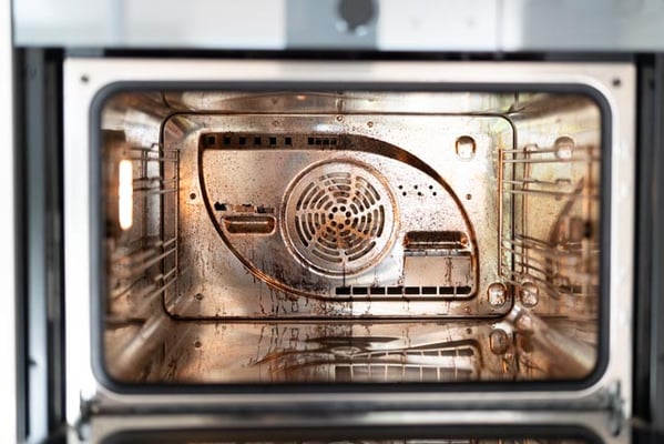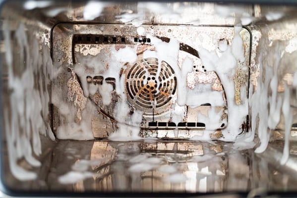 Falls der Heissluftventilator sehr verschmutzt ist: Das Blech der Rückwand abschrauben und reinigen. Dann wieder montieren und die anderen Seiten des Ofens einsprühen und reinigen. Auf diese Weise muss die Rückwand mit allen Öffnungen (vor allem die Ventilatoröffnung) nicht eingesprüht werden. So hat man später keine Reinigungsmittel im Essen.